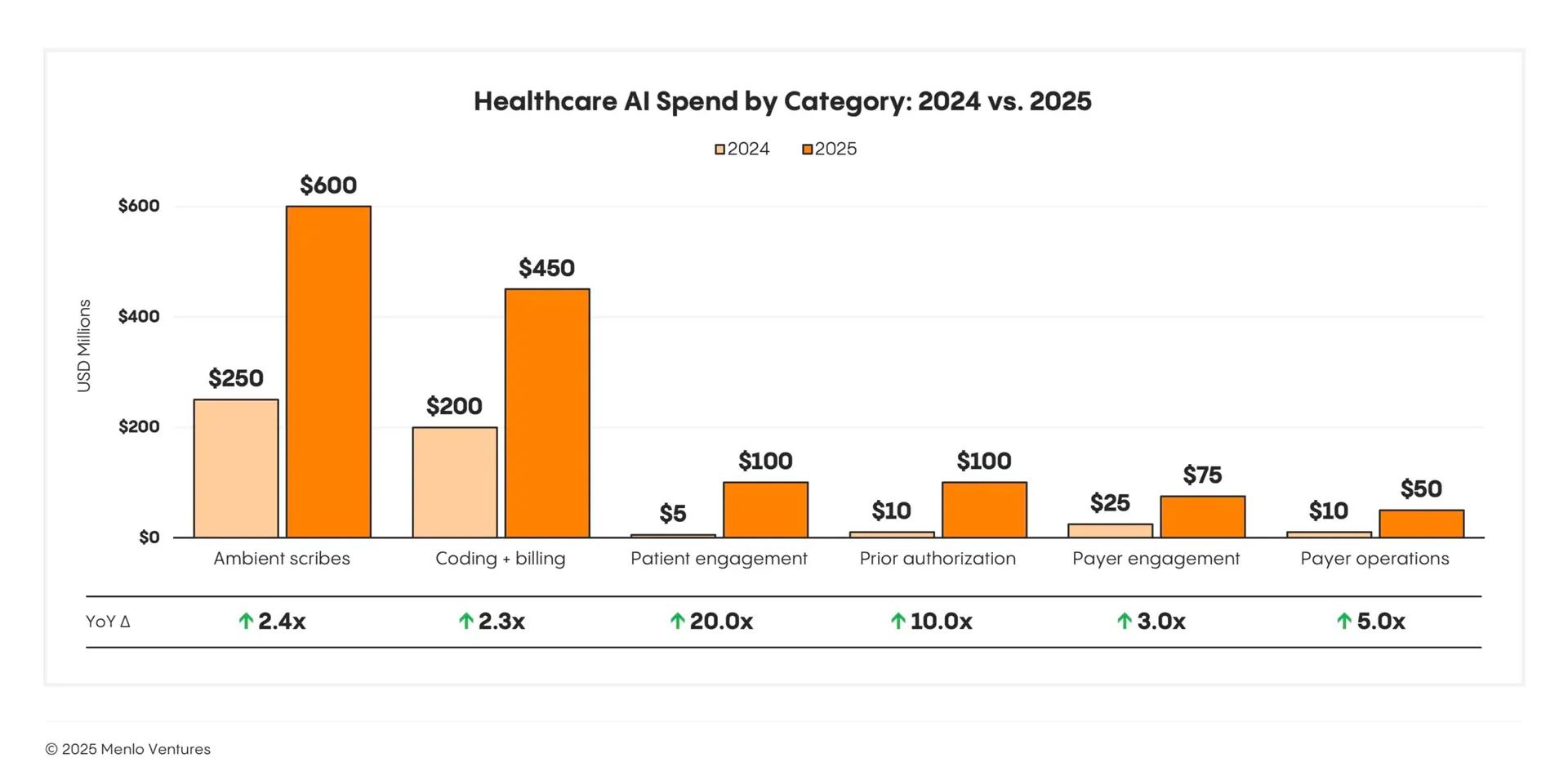Menlo Ventures released its State of AI in Healthcare Report, which I found informative during my 5 AM Friday morning writing session—racing to finish the Huddle before my daughter wakes up. The report focused heavily on AI scribes, which are old news in my opinion. Scribes are becoming the "pager" of healthcare: everyone has one, and if you don't, something's wrong.