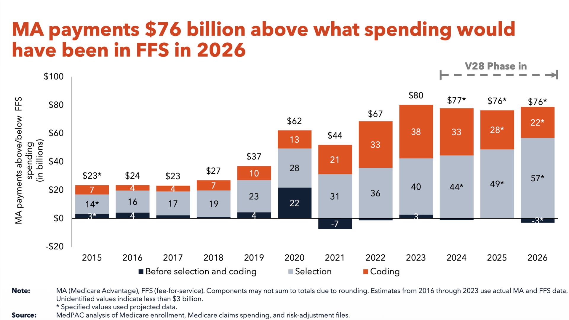 Coding Intensity (Upcoding): MA plans document every possible diagnosis to inflate risk scores and increase government payments (higher risk scores = higher monthly payments). MedPAC estimates this adds 4 percentage points to MA spending compared to traditional Medicare. Aggressive tactics like in-home assessments that capture diagnoses without follow-up care lead to billions in overpayments.