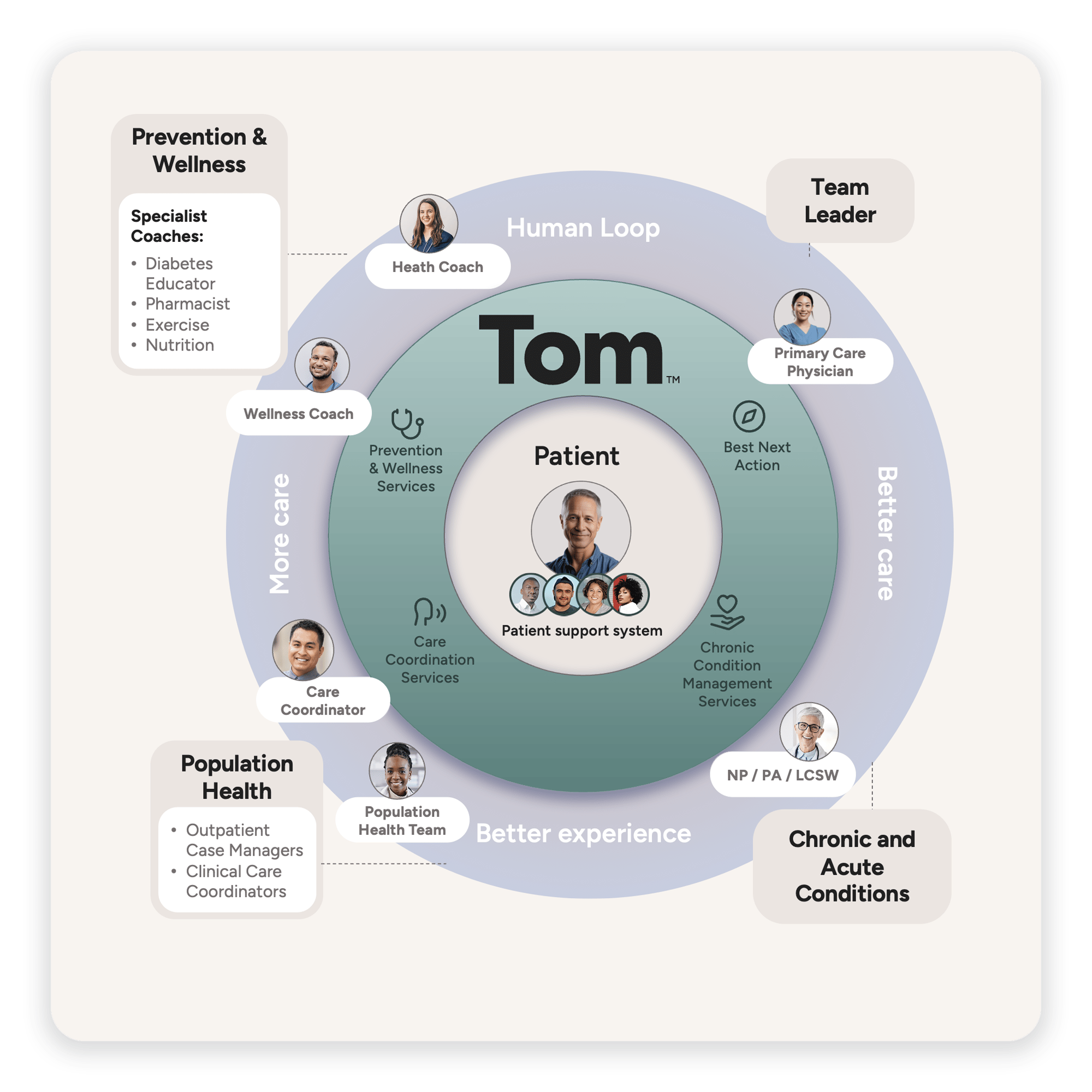 Tom is a multi-agent agentic AI operating system designed to function as a full member of the primary care team—an always-on system that checks in on patient populations, identifies the best next action for each patient, and then takes that action. Tom doesn't replace members of the care team but rather augments the staff, helping to free up capacity to spend more meaningful time with patients.