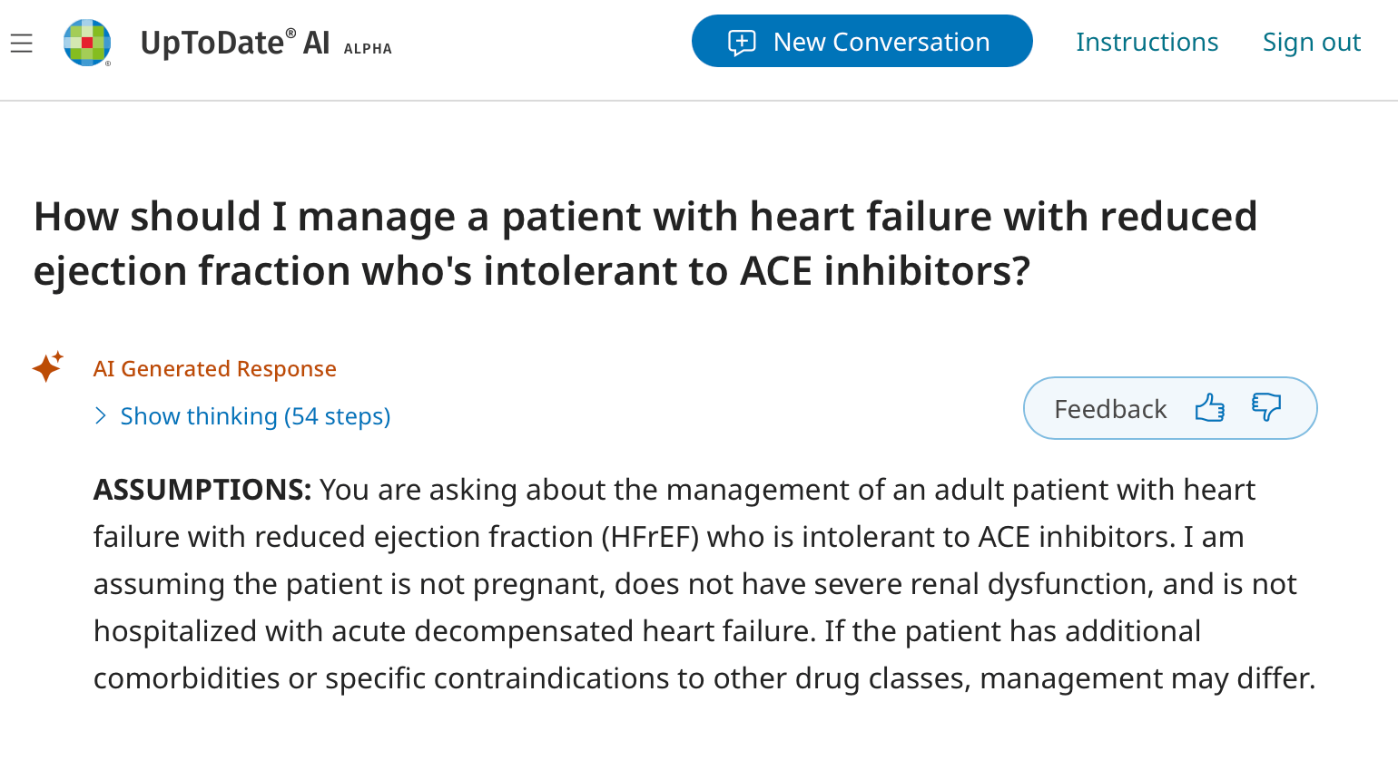 The interface feels familiar if you're already an UpToDate user—clean, medical-focused, no distractions. But the conversational approach changes how you interact with the content. Instead of navigating through topic hierarchies, you can ask direct questions like "How should I manage a patient with heart failure with reduced ejection fraction who's intolerant to ACE inhibitors?"